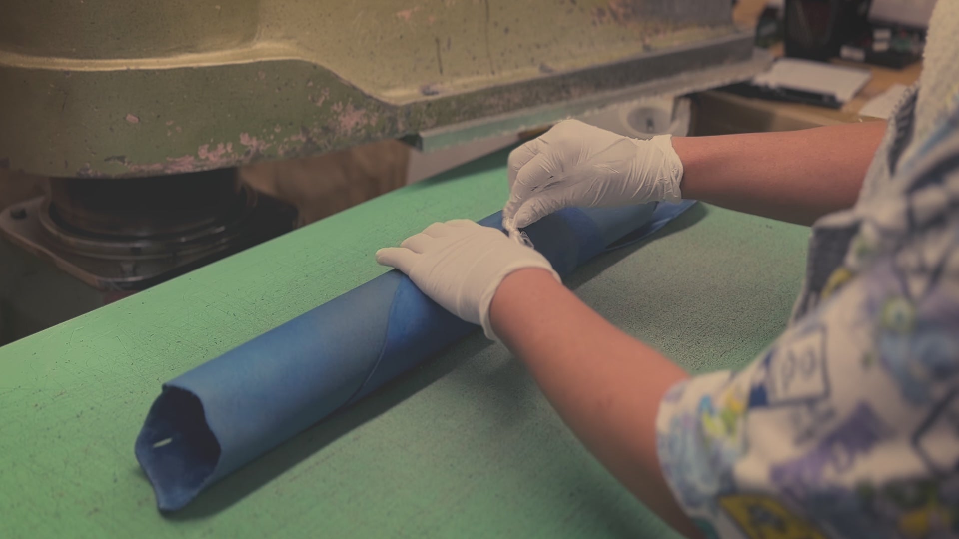 表面は全体をバフ掛けで微起毛させた後、特殊なやすりを使い手作業で細かな傷が付けられており、